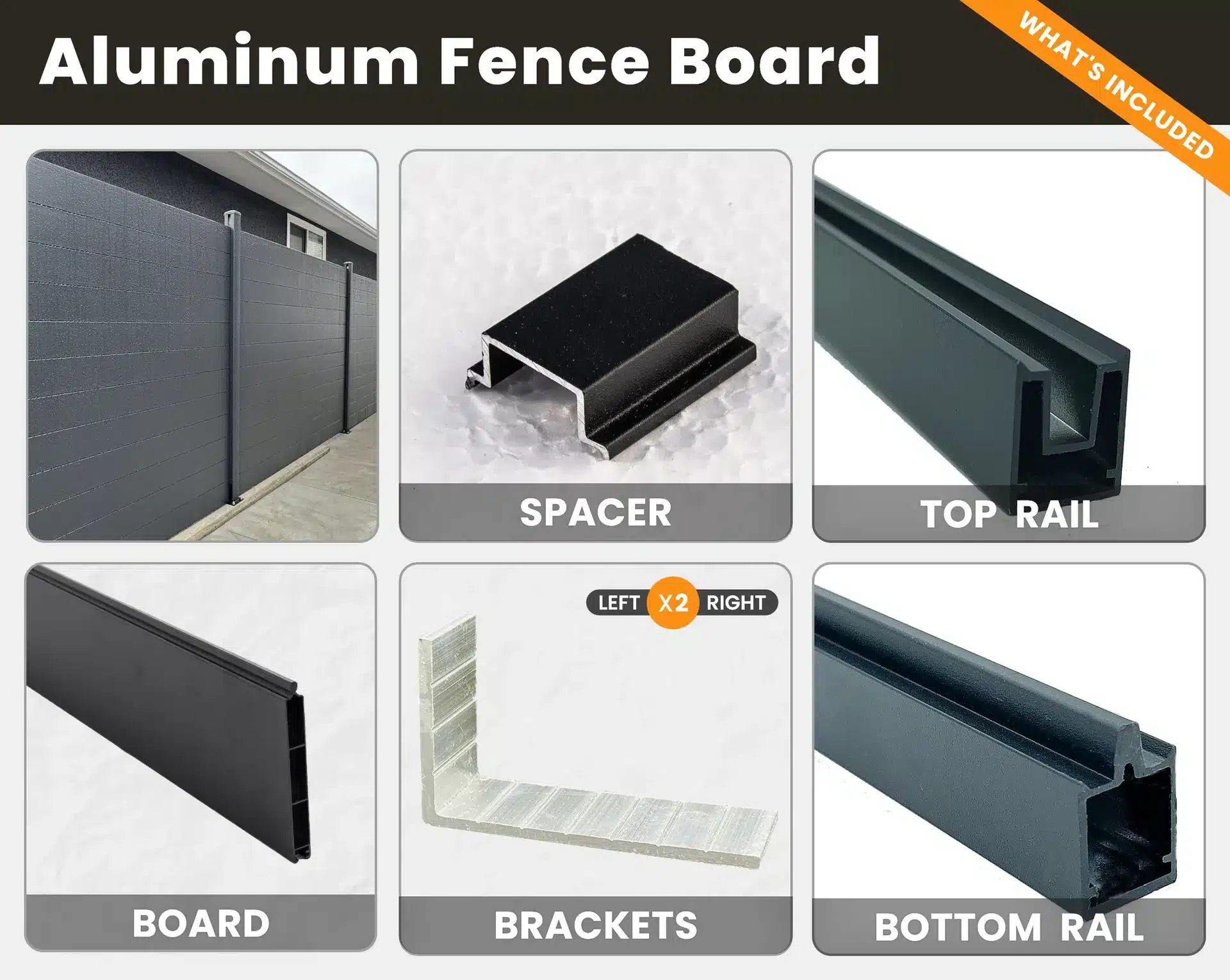 - 14 pieces of aluminum fence boards | 4″ wide x 8ft long